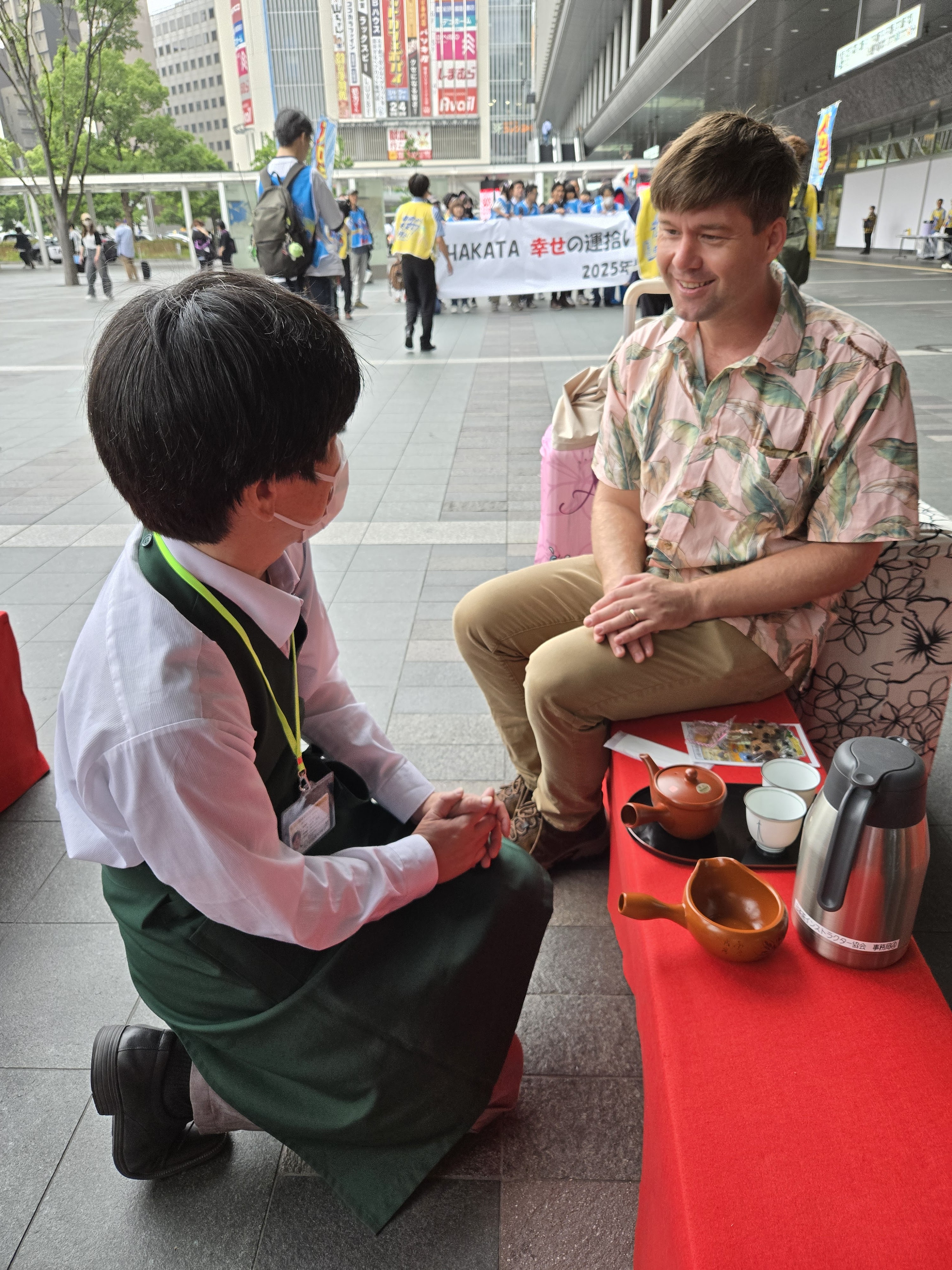 After getting to Fukuoka (our arrival destination by plane), the very first thing we encountered, we said “yes” to. Outside Fukuoka station was a booth offering freshly brewed tea from the region. Being a tea enthusiast, hubby couldn’t resist.