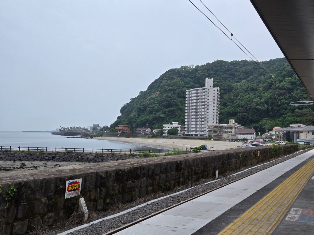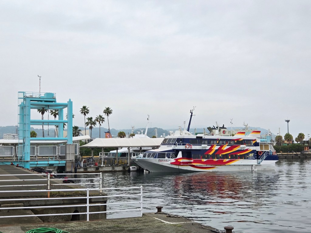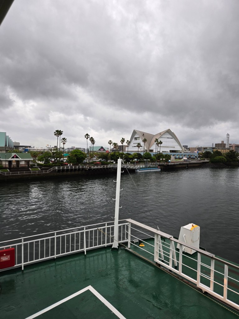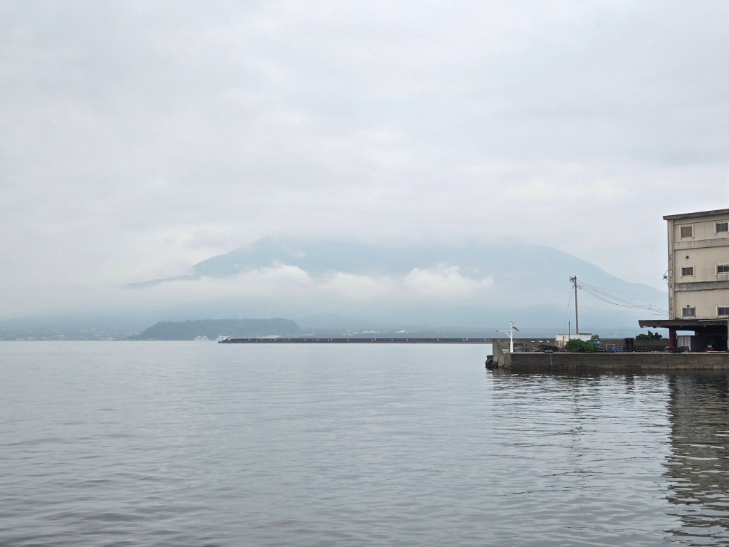 After breakfast, we wanted to explore the city per usual. We came across our favorite udon chain restaurant, but it was closed. Our wandering took us along more industrial buildings and shops, to the port. The sky was overcast, but we still were able to see Sakurajima island through the clouds.