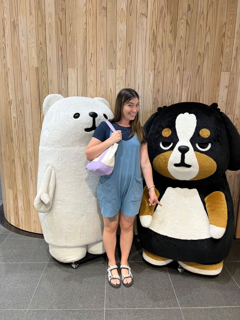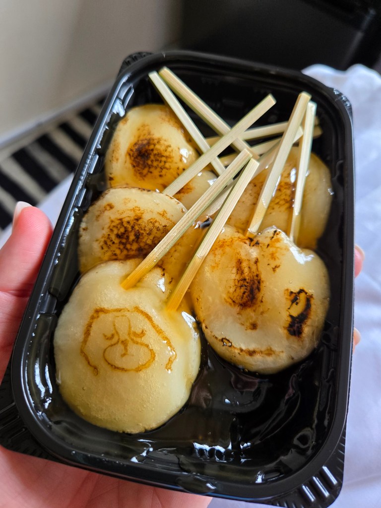 Our feet then took us inland past some bookstores that we browsed, a community center where elderly visitors were watching nature videos and a shop that sold grilled mochi in a syrup (branded with the city’s mascot):
