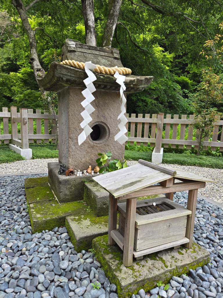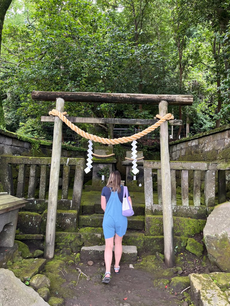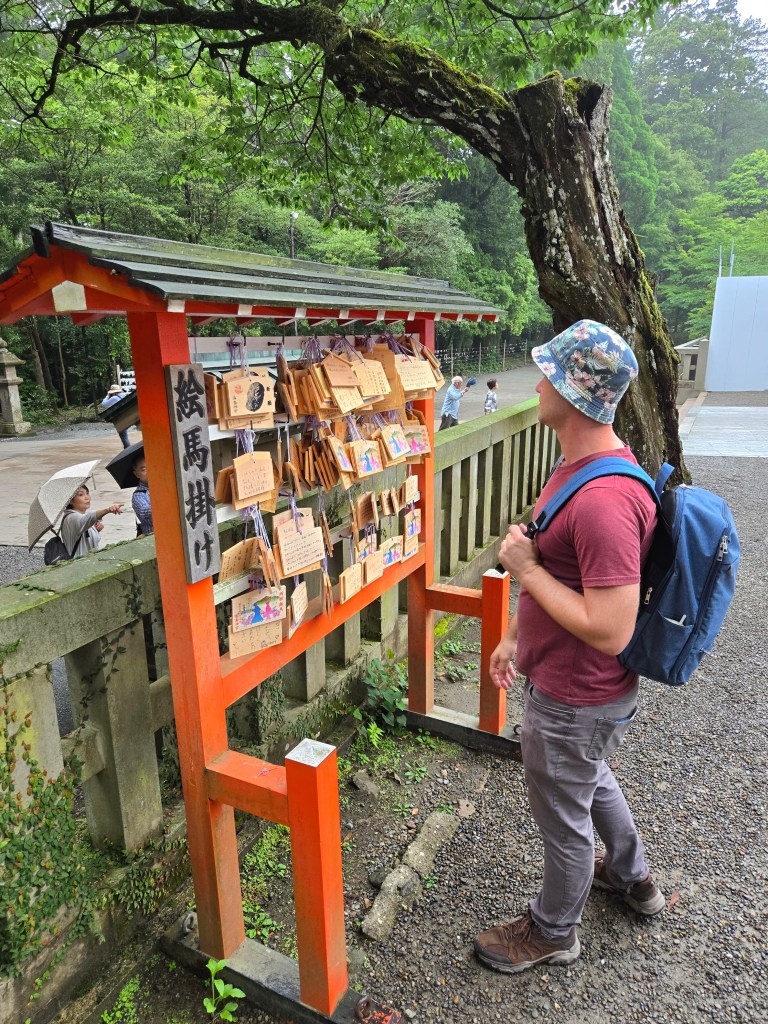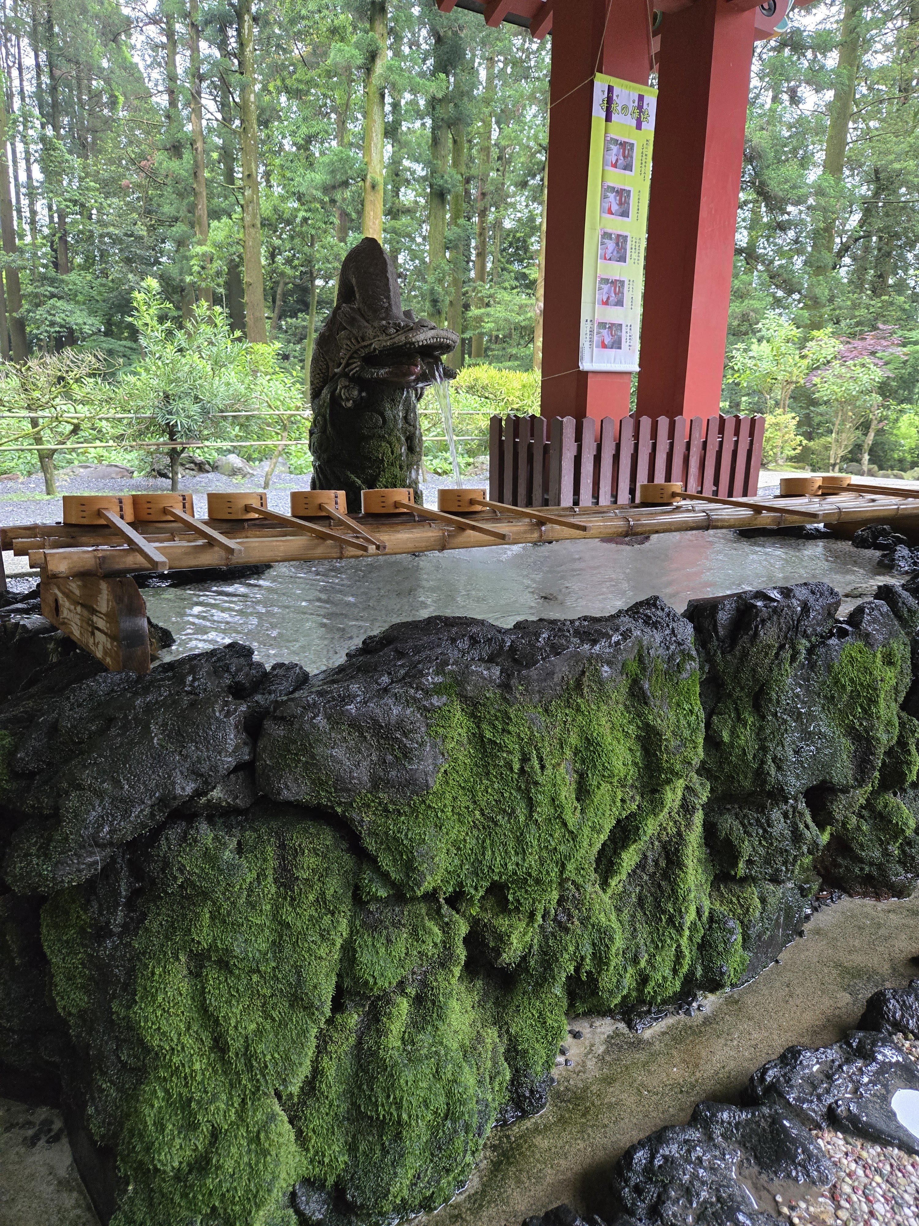 We hiked up to Kirishima shrine, and when we were just in front of the shrine we noticed some hot onsen water gushing down the side of the road in a gully. We followed it up a path nearby and found a shrine dedicated to the mountain. I donated and purchased my own token/charm to hang.