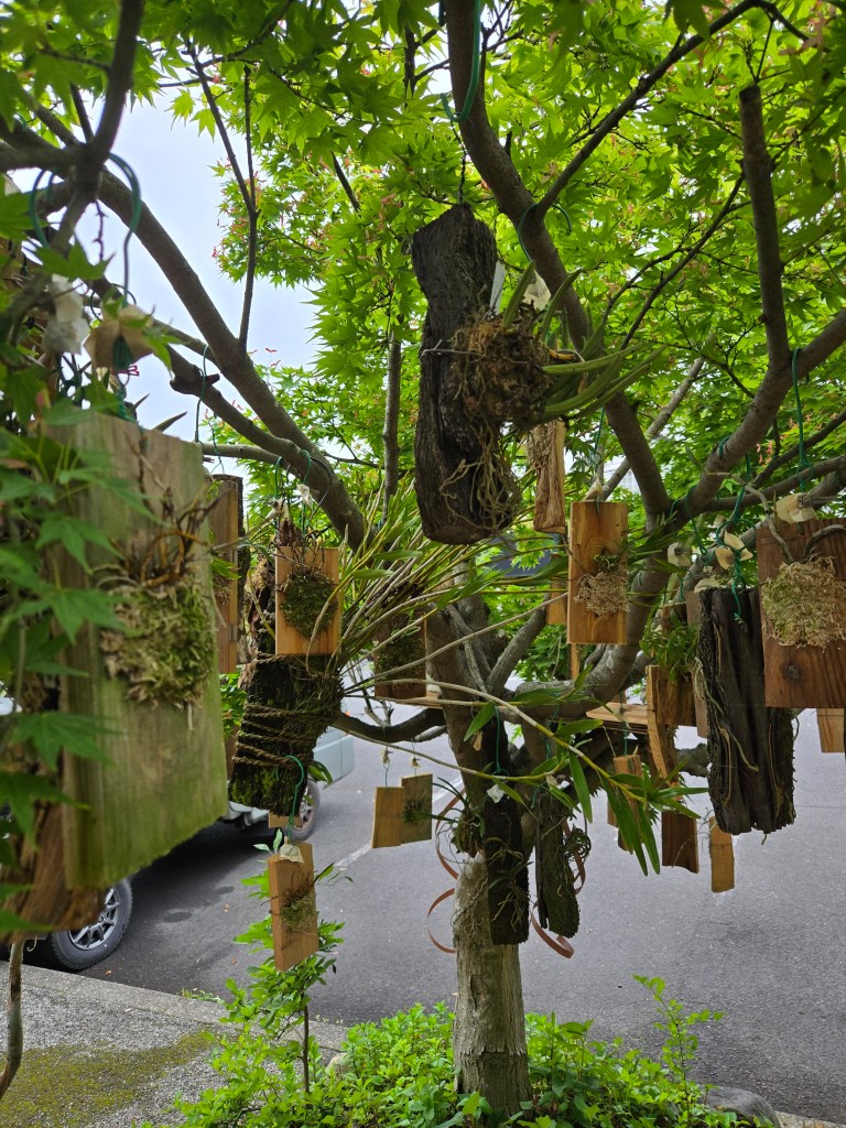 There was a gardening (?) store that sold air plants, seen growing here from items hanging from the tree outside the store. Cats loved to climb up in the trees.