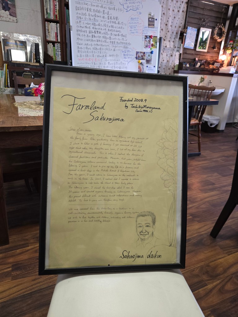 We were happy to be able to try the food here – run by a local family, for many years. They use produce grown on the island, so everything you eat is guaranteed to be nourished by the volcanic ash falling on the crops. They had a story posted about the original founder of the restaurant, and a picture of an award-winning turnip (among others). They also sold pretty hand-crafted items and desserts.