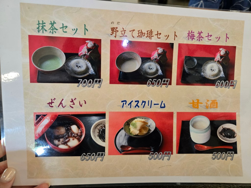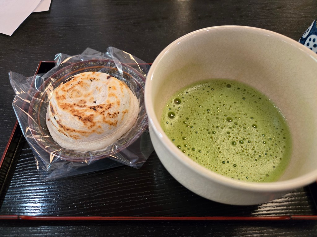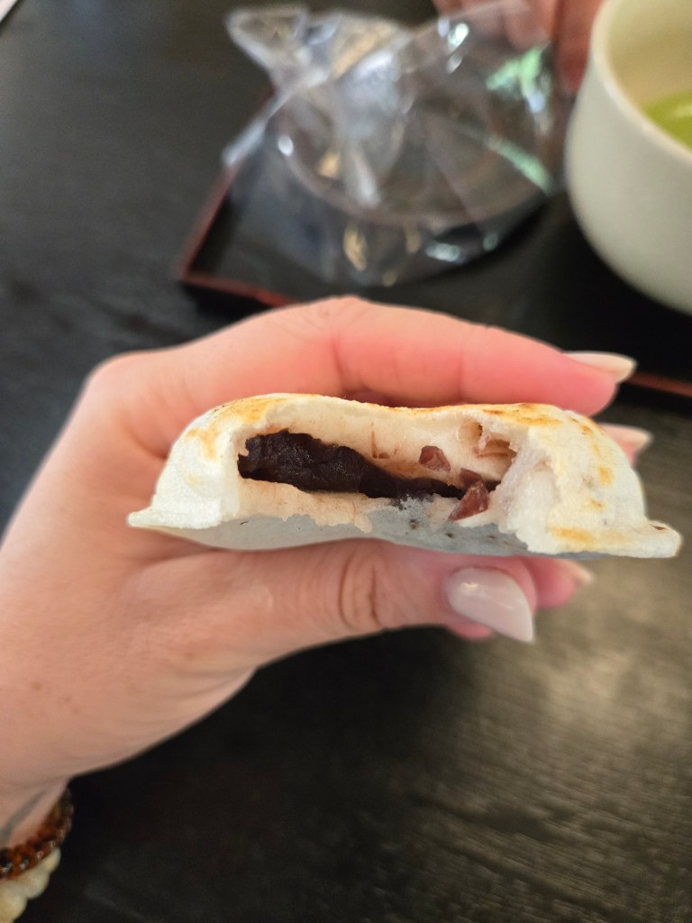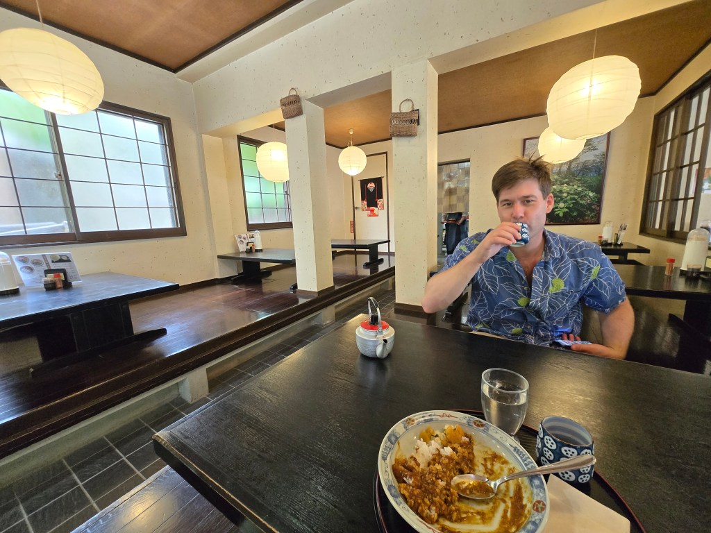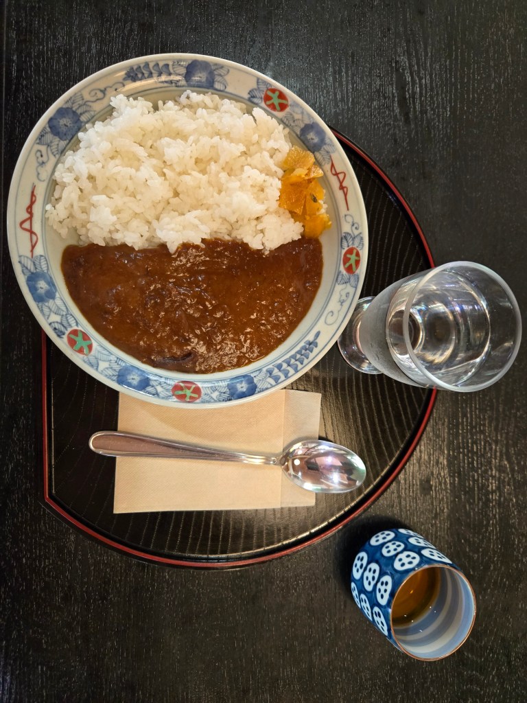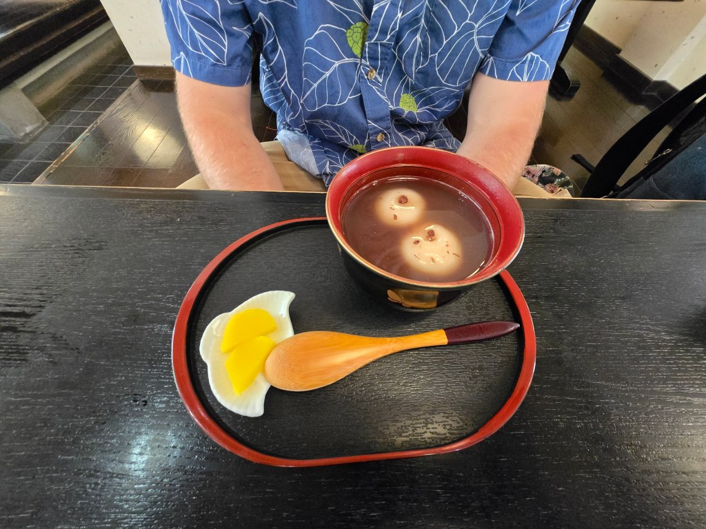 It was a very pleasant, traditional-style building with lots of air flow and classic Japanese cuisine. Hubby enjoyed some red bean mochi (soup?) and I ordered the matcha with grilled mochi. I also was starving so I ordered some curry, too.