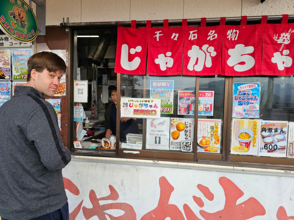 After driving a bit, he pulled over at a lookout with bathrooms, a shop and a potato stand. I had noticed that as we were driving, we passed several fields and farms along the way. Our guide explained that the area is famous for growing potatoes. The stand sold potatoes on a stick, and they were really good and hit the spot for me.