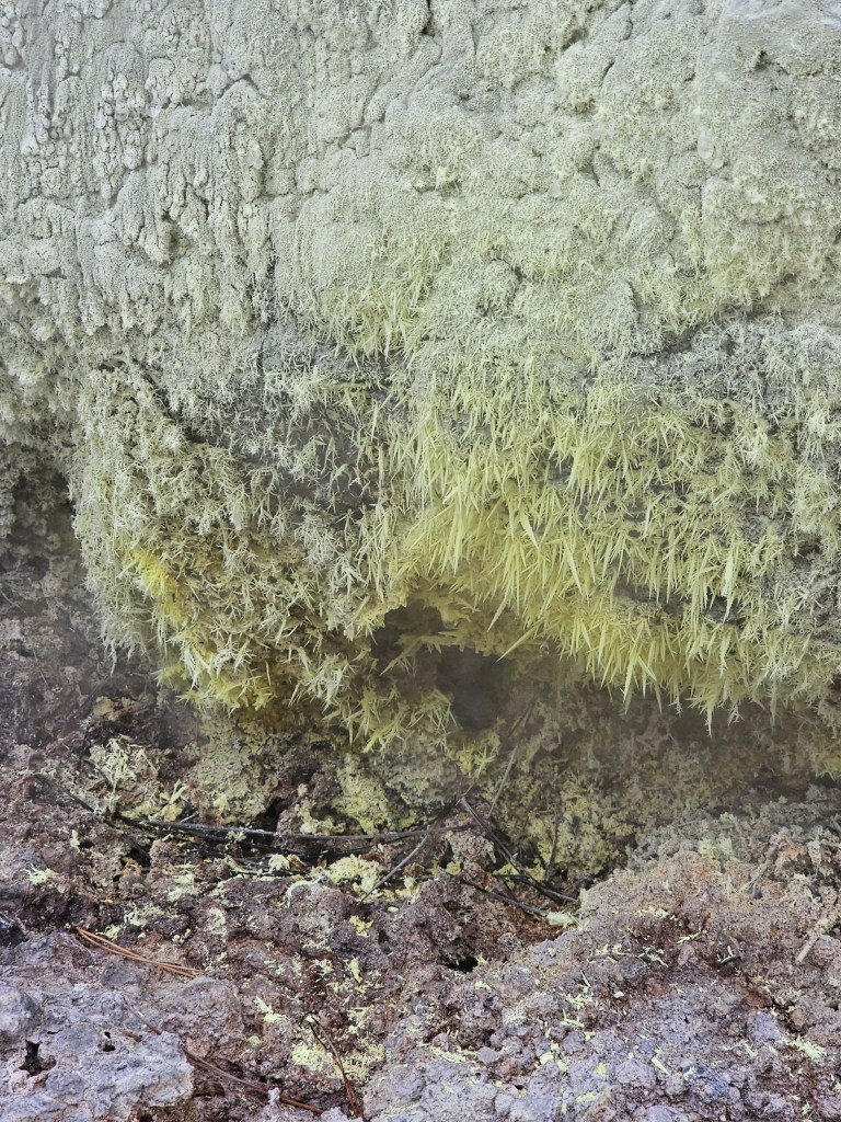 Steam was bursting out of so many sites along the path. Sulfuric crystals gathered on rocks, and hot water bubbling up everywhere and running down the incline, leaving steam curling into the chilly autumn air.